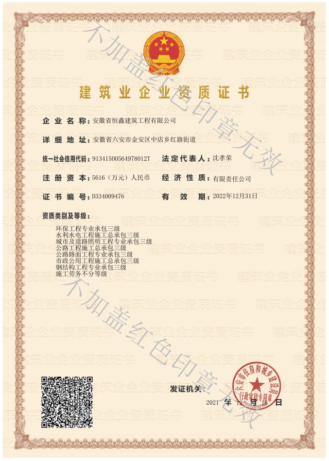 公司目前主要的資質(zhì)范圍:建筑工程施工總承包二級(jí),市政公用工程總承包三級(jí)、水利水電工程施工總承包三級(jí),公路工程施工總承包三級(jí);建筑裝修裝飾工程專業(yè)承包二級(jí),電子與智能化工程專業(yè)承包二級(jí)、建筑幕墻工程專業(yè)承包二級(jí),城市及道路照明專業(yè)承包三級(jí)、鋼結(jié)構(gòu)工程專業(yè)承包三級(jí),公路路面工程專用承包三級(jí)。